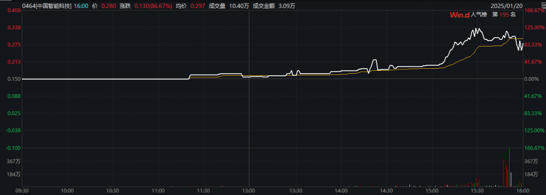 值得注意的是,中国智能科技尾盘飙升,一度暴涨超160%。资料显示,中国智能科技是一家主要从事电子及电器产品业务的香港投资控股公司。该公司的主要业务包括电子美发产品及其他小型家用电器的设计、制造及销售。其主要产品包括吹风机、直发夹及卷发器等。该公司主要在欧洲及亚洲开展业务。