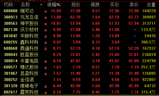 铜缆连接概念盘中走势强劲,截至收盘,瑞可达涨超15%,兆龙互连涨近14%,神宇股份涨超10%,沃尔核材、华脉科技等涨停。