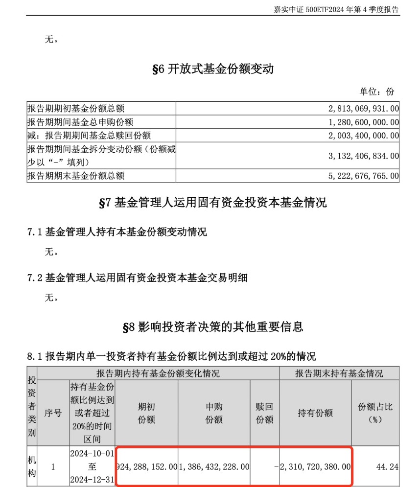 中国证券报记者追溯发现,2024年四季报中“机构1”期初持有嘉实中证500ETF的数量与2024年三季报中“机构1”、2024年中报中“中央汇金投资有限责任公司”持有的数量保持一致。由此可以推断,2024年四季度中央汇金投资有限责任公司耗资67.64亿元增持13.86亿份该ETF。