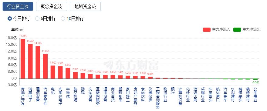 行业资金方面,截至收盘,房地产开发、消费电子、通信设备等净流入排名靠前,其中房地产开发净流入17.68亿。