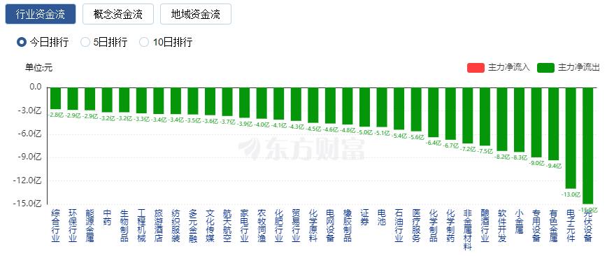 净流出方面,光伏设备、电子元件、有色金属等净流出排名靠前,其中光伏设备净流出14.97亿元。
