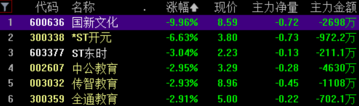 教育板块回调,国新文化、中公教育、全通教育等跌幅居前。