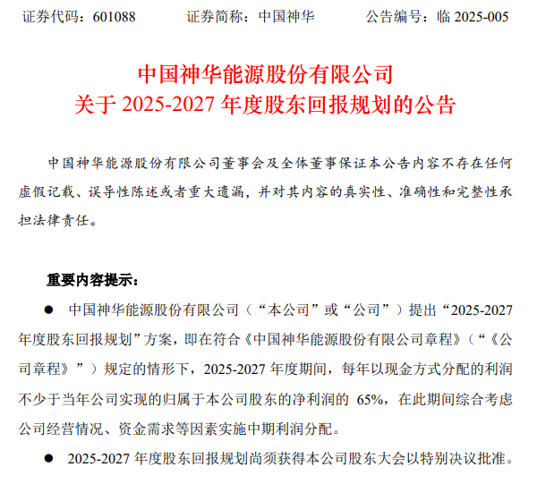 1月21日,中国神华公告,提出“2025-2027年度股东回报规划”方案,即在符合公司章程规定的情形下,2025-2027年度期间,每年以现金方式分配的利润不少于当年公司实现的归属于本公司股东的净利润的65%,在此期间综合考虑公司经营情况、资金需求等因素实施中期利润分配。2025-2027年度股东回报规划尚须获得本公司股东大会以特别决议批准。