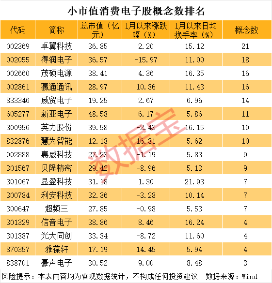 市值较低、换手率较高的个股弹性更大。证券时报·数据宝统计,市值低于50亿元、1月以来日均换手率超5%的消费电子股票合计有17只。其中,慧为智能、雅葆轩、威贸电子等个股市值均低于20亿元。慧为智能是一家方案设计公司(IDH)及ODM制造商,致力于提供客户嵌入式的软硬件解决方案,为知名品牌商及OEM客户提供专业的产品设计服务与制造。
