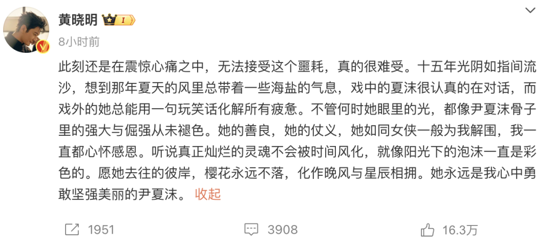 随后,刘若英、胡兵、朱孝天、黄晓明等众多明星发文悼念。