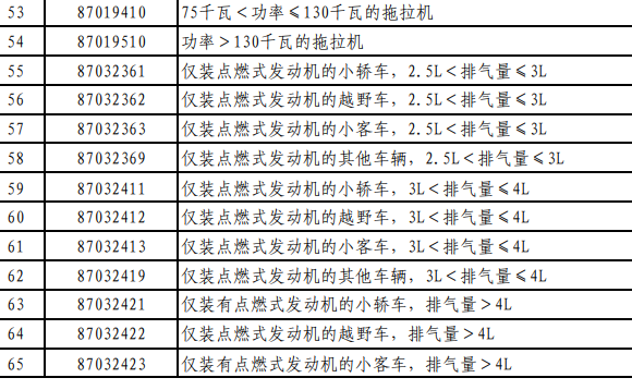 从汽车品类来看,主要包括排量大于2.5L的燃油车(包含轿车、越野车、小客车以及其他车辆产品);车重小于或等于5吨的货车;纯电动货车;牵引车、拖拉机等大排量汽车、皮卡。