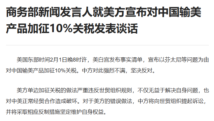 事实上,在我国正式宣布对美部分产品加征关税前,商务部发言人就曾明确中国会采取相应措施来应对。“面对美方的错误做法,我国将向世贸组织提起诉讼,并将采取相应反制措施坚定维护自身权益。”商务部新闻发言人2月2日对外表示。2月5日,商务部新闻发言人对外表示,中方为捍卫自身合法权益,已将美征税措施诉至世贸组织争端解决机制。