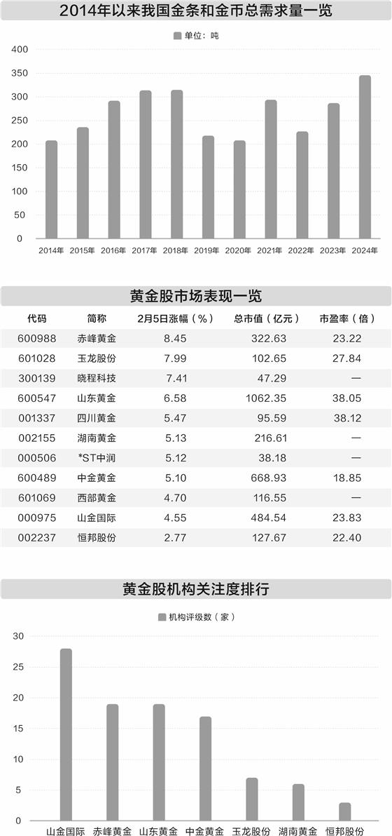 2024年度,全球黄金需求再次刷新纪录,各国央行及投资者大量购金推动市场需求。我国黄金投资持续火热,金条和金币总需求量创近11年新高。受此影响,黄金板块上市公司业绩向好,行业景气度提升。