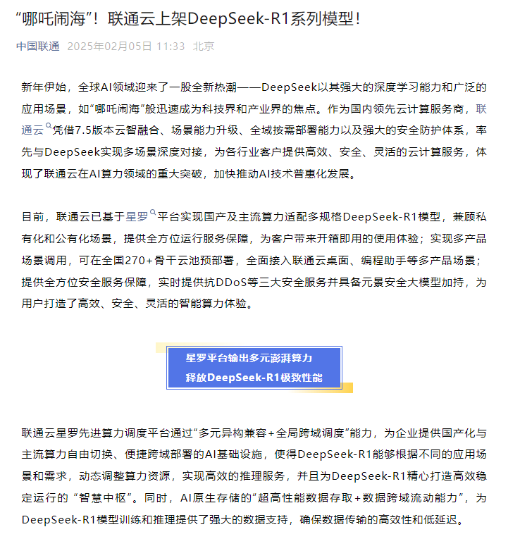 据中国联通官微,作为国内领先云计算服务商,联通云凭借7.5版本云智融合、场景能力升级、全域按需部署能力以及强大的安全防护体系,率先与DeepSeek实现多场景深度对接,为各行业客户提供高效、安全、灵活的云计算服务,体现了联通云在AI算力领域的重大突破,加快推动AI技术普惠化发展。