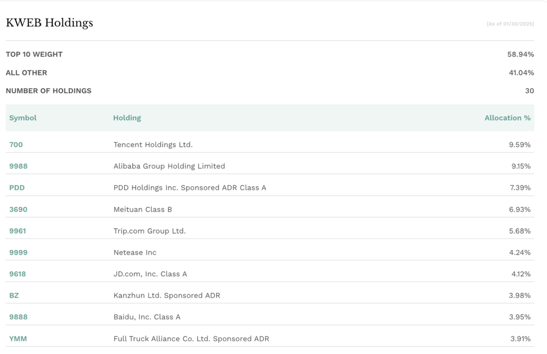 KWEB跟踪指数的前十大重仓股中,互联网、科技股含量较高。不少机构对包括阿里巴巴在内的中国互联网科技股给出了乐观评级。例如,1月21日,美国银行的分析师Joyce Ju将阿里巴巴股票的目标价格提升,保持买入评级。