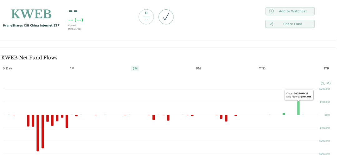 1月29日,跟踪中国海外互联网指数的ETF KWEB录得净流入1.05亿美元。时隔数月,KWEB再度获显著资金净流入。KWEB 跟踪中国互联网指数。该指数的前十大重仓股包括腾讯控股、阿里巴巴、拼多多、美团、携程、网易、京东、BOSS直聘(看准科技)、百度、满帮。