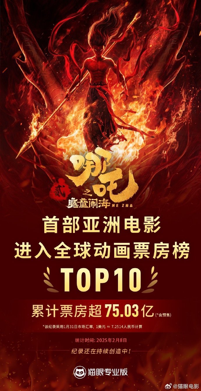 据猫眼专业版数据,《哪吒之魔童闹海》累计票房(含预售)超75.03亿元,超《神偷奶爸3》票房成绩,成为首部进入全球动画电影票房榜前10亚洲电影!