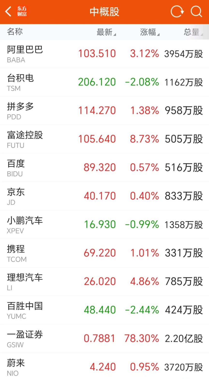 中概股涨多跌少,纳斯达克中国金龙指数涨1.34%。富途控股涨超8%,老虎证券涨超6%,理想汽车涨超4%,阿里巴巴涨超3%,爱奇艺、哔哩哔哩涨超2%,拼多多涨超1%。