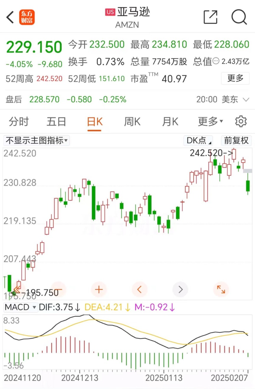 个股方面,美股七巨头之一的亚马逊跌超4%,其市值一夜蒸发1012亿美元(约合人民币7376亿元),创2024年12月18日以来最大单日跌幅。