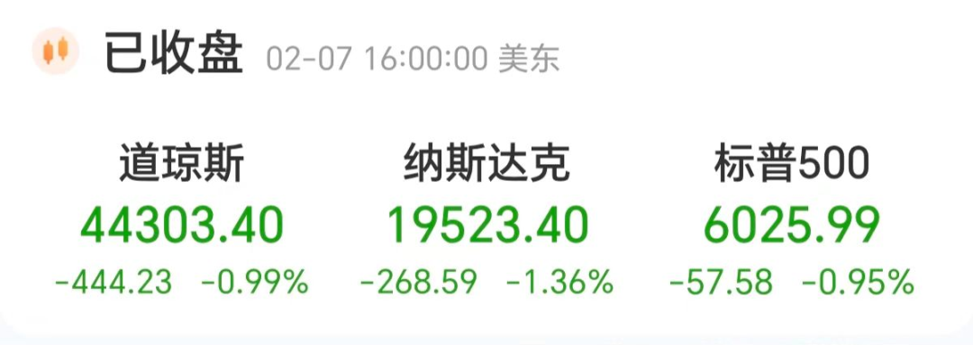 当地时间周五(2月7日)美股三大指数集体收跌。截至当天收盘,道琼斯工业平均指数比前一交易日下跌444.23点,收于44303.40点,跌幅为0.99%;标准普尔500种股票指数下跌57.58点,收于6025.99点,跌幅为0.95%;纳斯达克综合指数下跌268.59点,收于19523.40点,跌幅为1.36%。