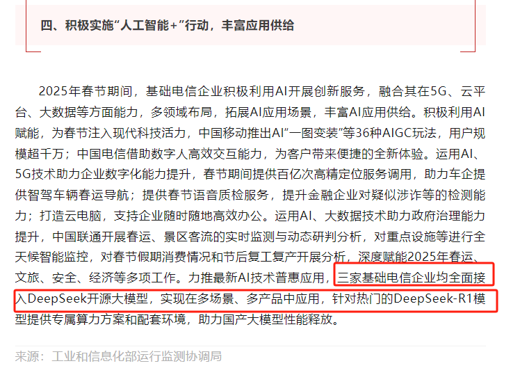 2月8日,工业和信息化部运行监测协调局发布2025年春节通信业务相关情况。2025年春节期间,基础电信企业积极利用AI开展创新服务。其中,中国移动、中国电信、中国联通三家基础电信企业均全面接入DeepSeek开源大模型,实现在多场景、多产品中应用,针对热门的DeepSeek-R1模型提供专属算力方案和配套环境,助力国产大模型性能释放。