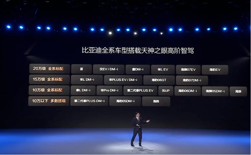 他强调,比亚迪的智驾要做的是“全民智驾”,20万元级别车系、15万元级别车系,以及10万元级别车系全部做到了全系标配“天神之眼”。而10万元级别以下的车型,例如海鸥等多数也将搭载“天神之眼”智驾系统。