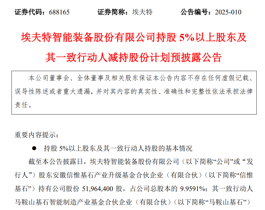 作为国产工业机器人头部企业,2月10日晚间,埃夫特发布了5%以上股东及其一致行动人减持股份计划预披露公告。两大股东同时宣布,各减持不超过782.67万股,合计减持比例不超过公司总股本的3%。