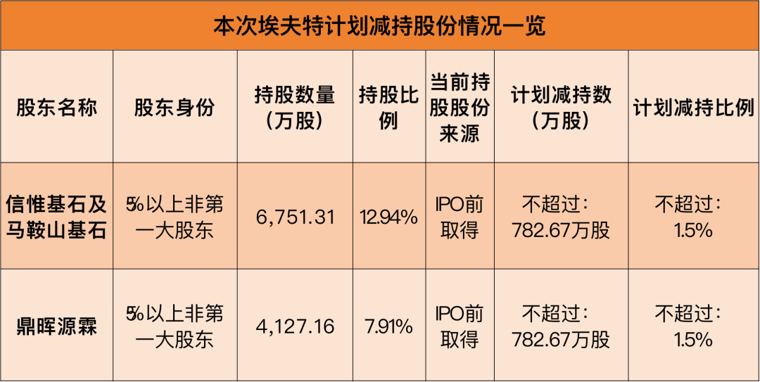 公告显示,信惟基石及马鞍山基石合计持有公司股份6751.31万股,占总股本的12.94%。因自身资金需求,二者拟通过集中竞价方式、大宗交易方式合计减持股份数量不超过782.67万股,减持股份比例不超过公司总股本的1.5%。其中,拟通过集中竞价交易方式减持股份数量不超过约522万股,减持比例不超过公司总股本的1%,且在任意连续90个自然日内减持的股份总数不超过公司股份总数的1%;拟通过大宗交易方式减持股份数量不超过约261万股,减持比例不超过公司总股本的0.5%,且在任意连续90个自然日内减持的股份总数不超过公司股份总数的2%。