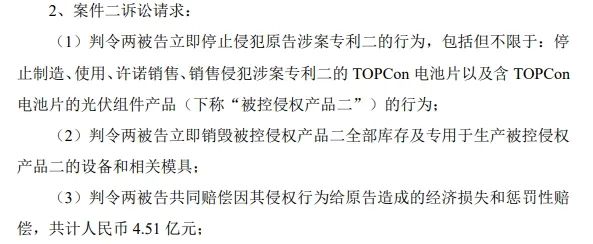 公告称,天合光能为涉案专利一“太阳能电池模块”、涉案专利二“太阳能电池及其制造方法”的合法专利权人。经比对分析,认为两被告共同实施的制造、许诺销售和销售的光伏组件等产品落入涉案专利一、涉案专利二的保护范围。天合光能就两被告侵害公司发明专利“太阳能电池模块”的专利权纠纷向法院提起诉讼,就两被告侵害公司发明专利“太阳能电池及其制造方法”的专利权纠纷向法院提起诉讼。截至本公告披露日,上述案件已立案受理,尚未开庭审理。除了停止生产,赔偿损失,诉讼还要求对方销毁库存。第二项诉讼涉及TOPCon电池片以及含 TOPCon 电池片的光伏组件产品。