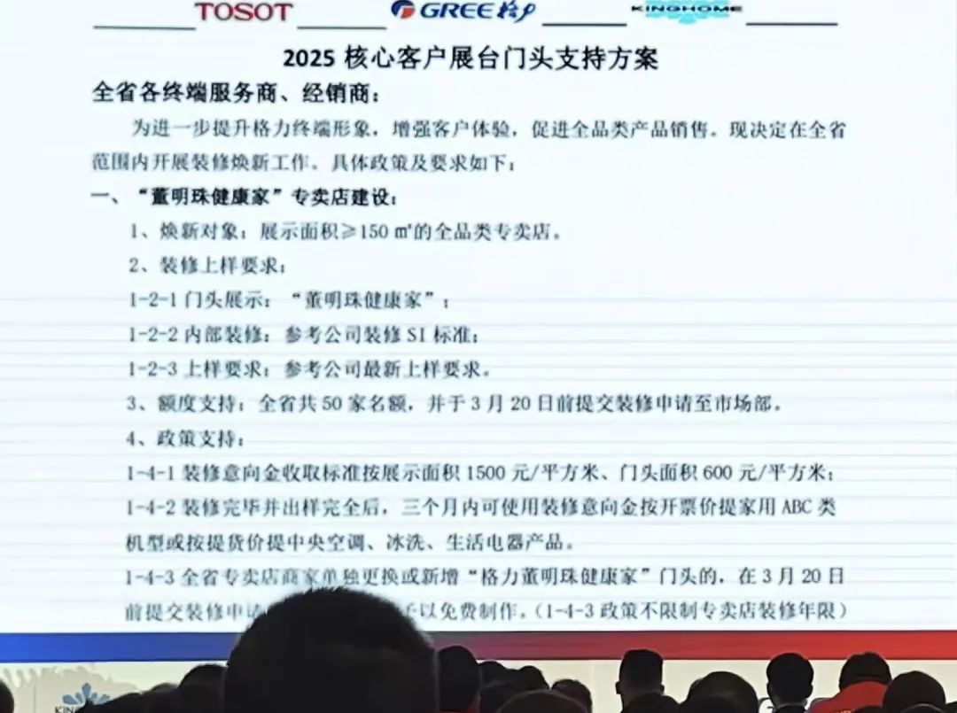 2月17日,记者从一位经销商处获得格力电器2025核心客户展示门头支持方案,内容显示,“董明珠健康家”专卖店的焕新对象为“展示面积≥150m²的全品类专卖店”,全省共50家名额。格力电器还提供相应的政策支持,装修意向金收取标准为“展示面积1500元/平方米、门头面积600元/平方米”,装修完毕并出样完全后,三个月内可使用装修意向金按发票价提家用ABC类机型或按提货价提中央空调、冰洗、生活电器产品。