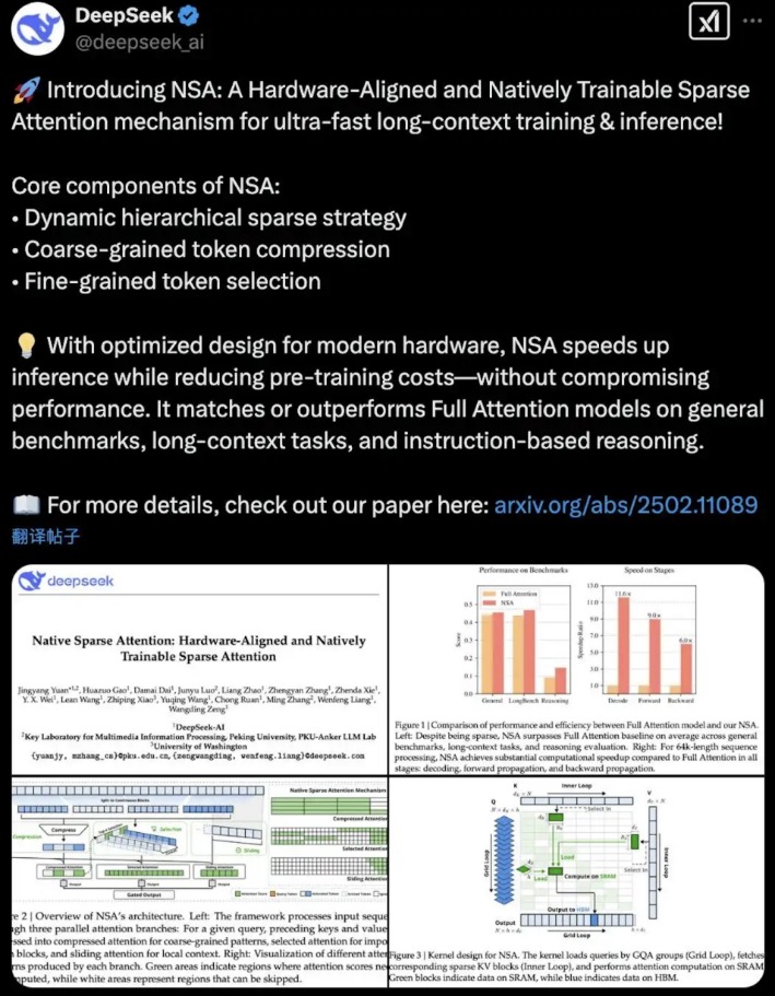 2月18日,DeepSeek在海外社交平台发布了一篇纯技术论文报告,论文主要内容是关于NSA(Natively Sparse Attention,原生稀疏注意力)。据介绍,这是一种用于超快速长文本训练与推理的、硬件对齐且可原生训练的稀疏注意力机制。