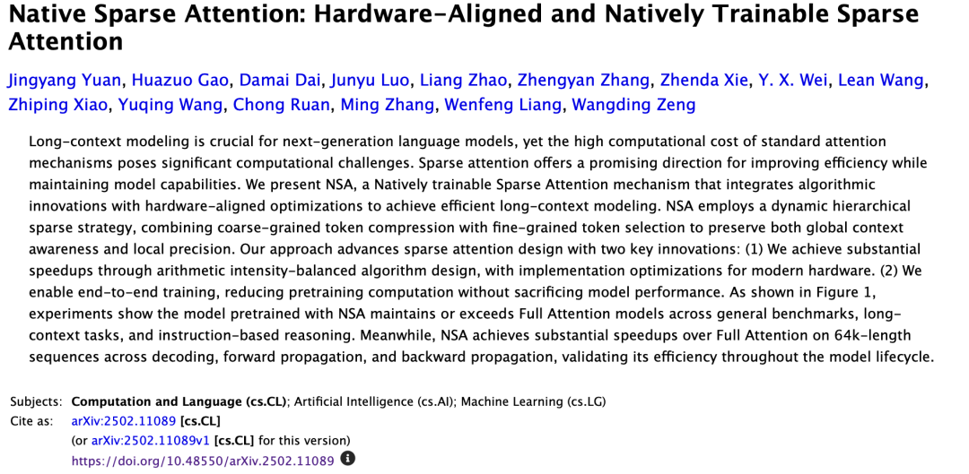 记者注意到,在这篇《原生稀疏注意力:硬件对齐且可原生训练的稀疏注意力机制》(Native Sparse Attention: Hardware-Aligned and Natively Trainable Sparse Attention)的论文署名中,DeepSeek创始人梁文锋也作为共创在列。