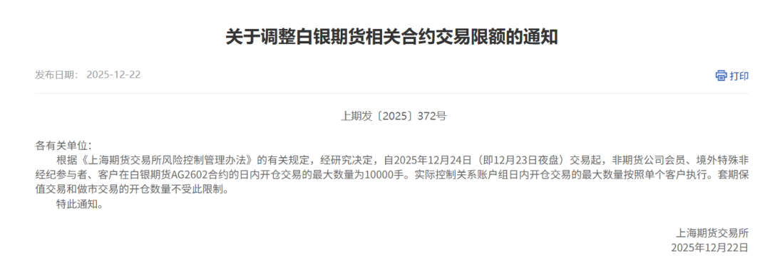 根据《上海期货交易所风险控制管理办法》的有关规定,经研究决定,自2025年12月24日(即12月23日夜盘)交易起,非期货公司会员、境外特殊非经纪参与者、客户在白银期货AG2602合约的日内开仓交易的最大数量为10000手。实际控制关系账户组日内开仓交易的最大数量按照单个客户执行。套期保值交易和做市交易的开仓数量不受此限制。