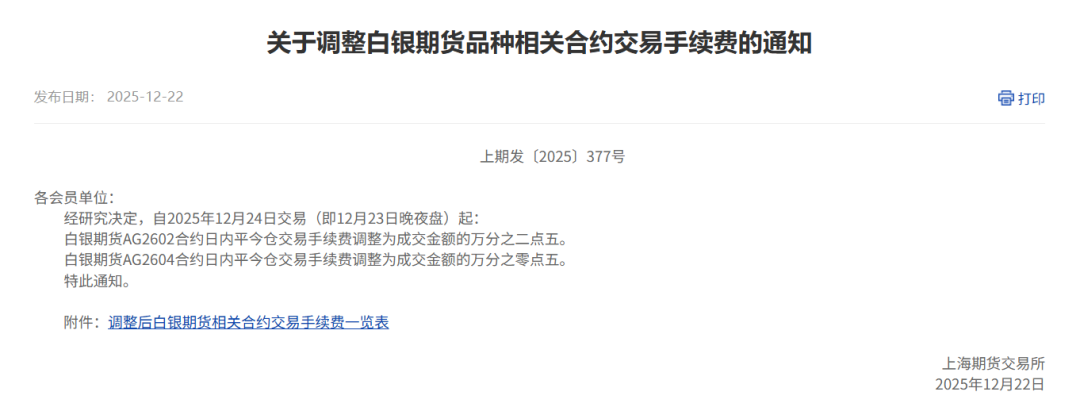 白银期货AG2604合约日内平今仓交易手续费调整为成交金额的万分之零点五。