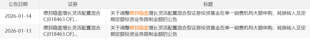 部分基金则宣布限购。德邦基金连发两则公告,调整德邦稳盈增长混合基金限购金额。根据公告,自1月14日起,德邦稳盈增长混合基金在单一销售机构大额申购A类、C类基金份额的金额上限,由原1000万元、100万元分别调整为10万元、1万元。类似的还有,1月13日,永赢基金发布公告,对旗下永赢高端装备智选混合、永赢信息产业智选混合两只基金进行限购。