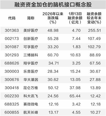 从融资资金来看,据证券时报·数据宝统计,截至1月13日,万得脑机接口26只概念股中,有19只属于融资融券标的,最新融资余额合计近255亿元,与去年末相比增加超过15%,其中17只个股获加仓,11只加仓幅度超过10%。