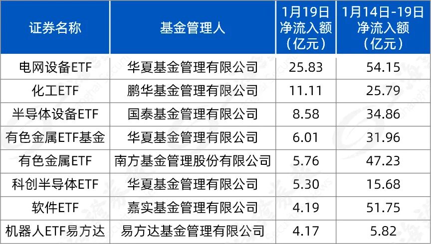 拉长时间看,1月14日-19日,华夏电网设备ETF净流入54.15亿元,南方有色金属ETF净流入47.23亿元,国泰半导体设备ETF、华夏有色金属ETF净流入超30亿元。