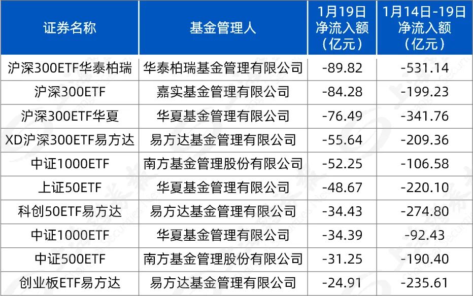 从1月19日ETF的资金流向看,据Choice测算,股票型ETF单日净流出421.93亿元。其中,宽基ETF遭遇较多资金流出。