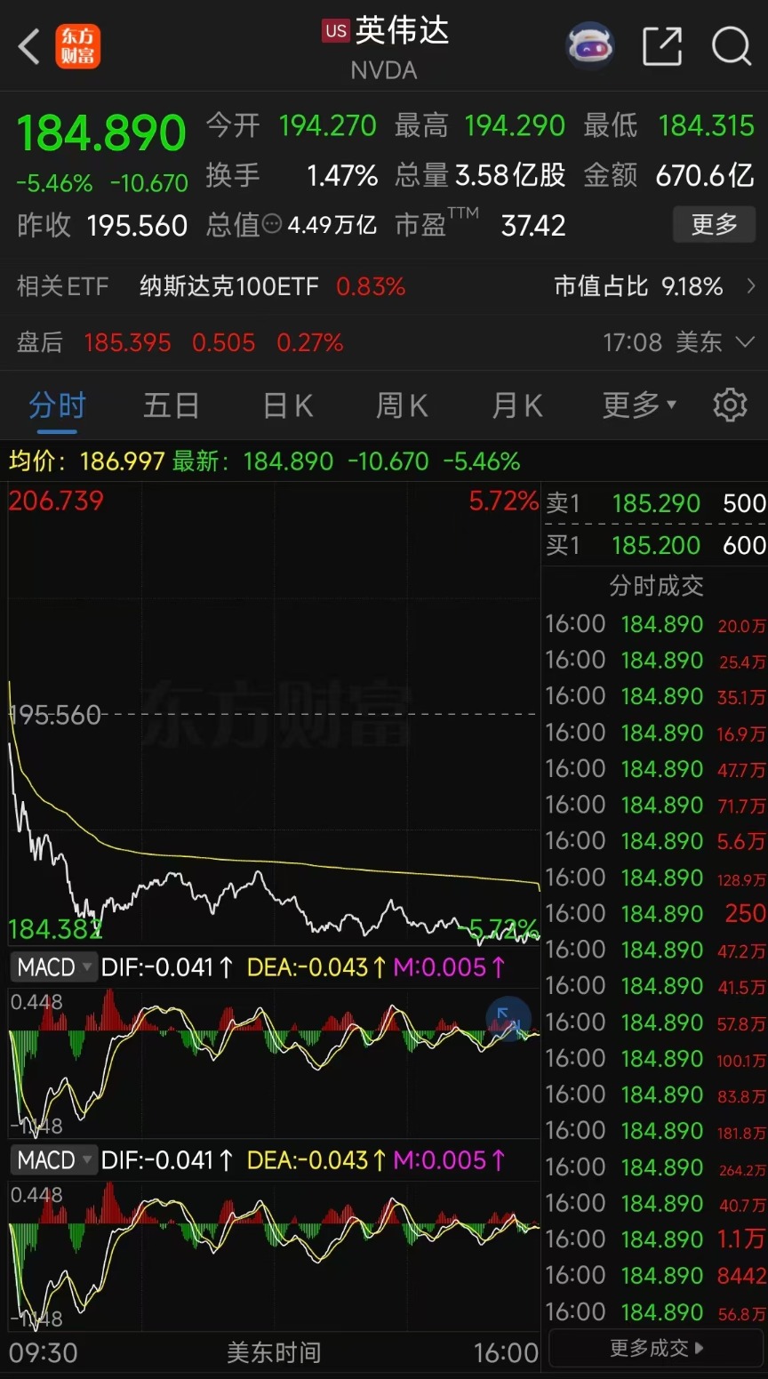 英伟达财报再超预期却遇冷淡回应,股价跌超5%,创去年4月16日以来最大单日跌幅。