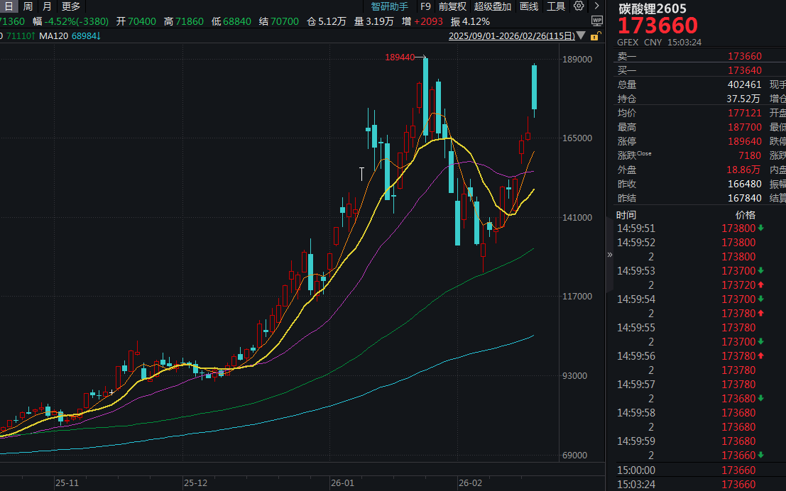 以当前主力LC2605合约为例,2月24日至25日,其结算价便从14.84万元/吨升至16.78元/吨。