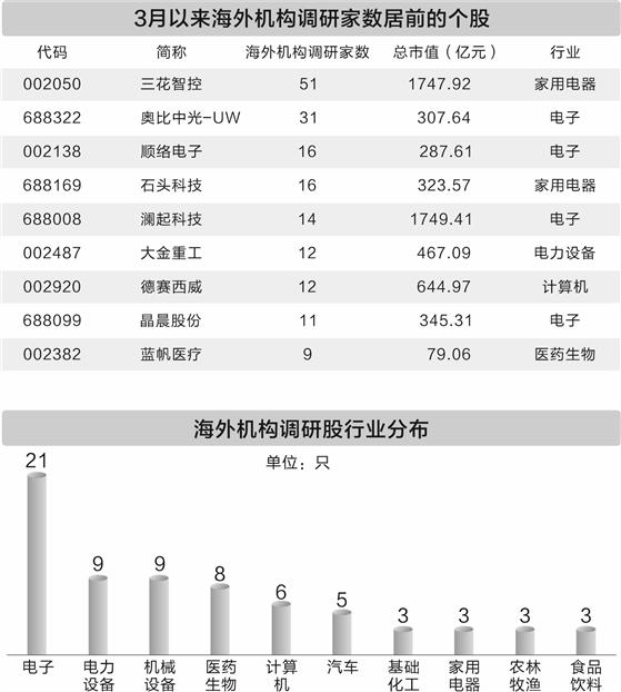 从获海外机构调研的家数来看,三花智控、奥比中光-UW、顺络电子和石头科技名列前茅,分别有51家、31家、16家和16家。