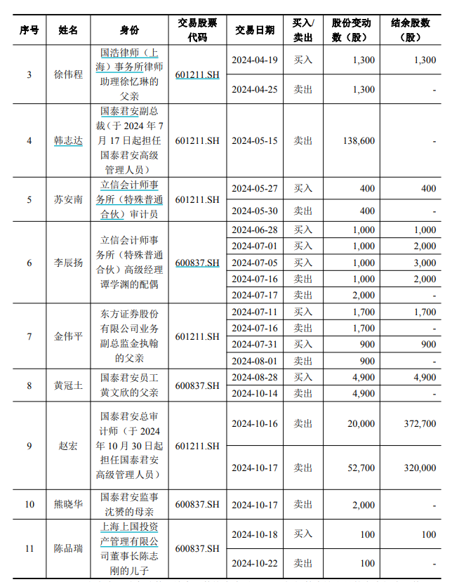 核查结果显示,11名相关自然人买卖国泰君安和海通证券A股股票,包括国泰君安副总裁韩志达、国泰君安总审计师赵宏、国泰君安监事沈赟的母亲熊晓华、国泰君安员工黄文欣的父亲黄冠土等。