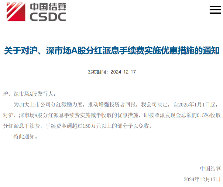 12月17日,中国结算发布《关于对沪、深市场A股分红派息手续费实施优惠措施的通知》。中国结算决定自2025年1月1日起,对沪、深市场A股分红派息手续费实施减半收取的优惠措施,即按照派发现金总额的0.5%。收取分红派息手续费,手续费金额超过150万元的部分予以免收。