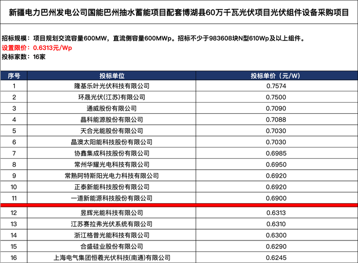 从协会公布的上述项目16家投标企业报价来看,11家高于0.69元/W,多是行业头部企业,包括隆基绿能(601012.SH)、TCL中环(002129.SZ)旗下环晟光伏、通威股份(600438.SH)、晶科能源(688223.SH)、天合光能(688599.SH)、晶澳科技(002459.SZ)、协鑫集成(002506.SZ)、华耀光电、阿特斯(688472.SH)、正泰新能、一道新能。