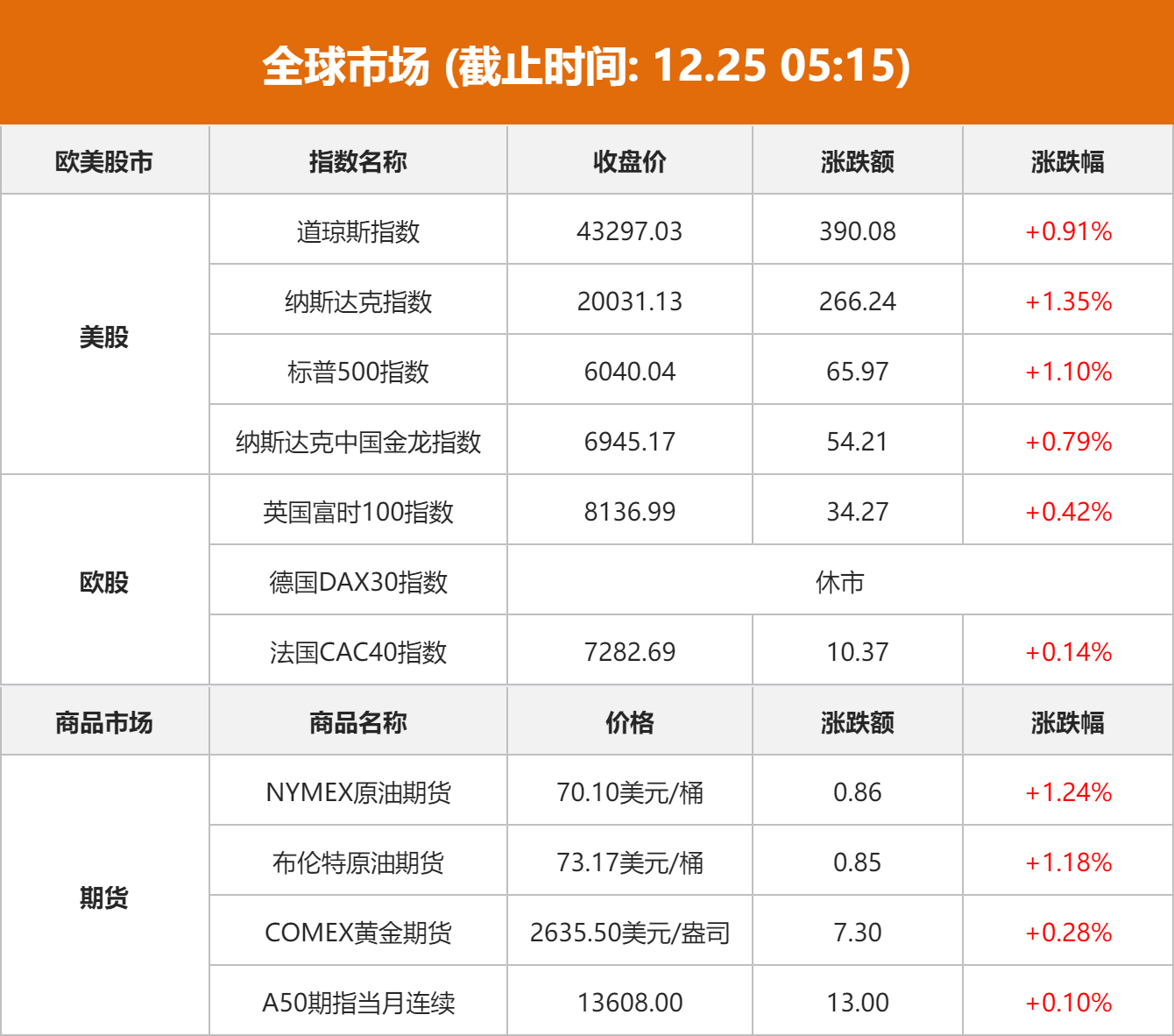 美股市场:美股三大指数集体上涨,纳指、标普涨超1%。截至当天收盘,道琼斯工业平均指数比前一交易日上涨390.08点,收于43297.03点,涨幅为0.91%;标准普尔500种股票指数上涨65.97点,收于6040.04点,涨幅为1.10%;纳斯达克综合指数上涨266.24点,收于20031.13点,涨幅为1.35%。12月25日为美国传统节日圣诞节,纽约股市24日提前至下午1时收市,25日将休市一天。