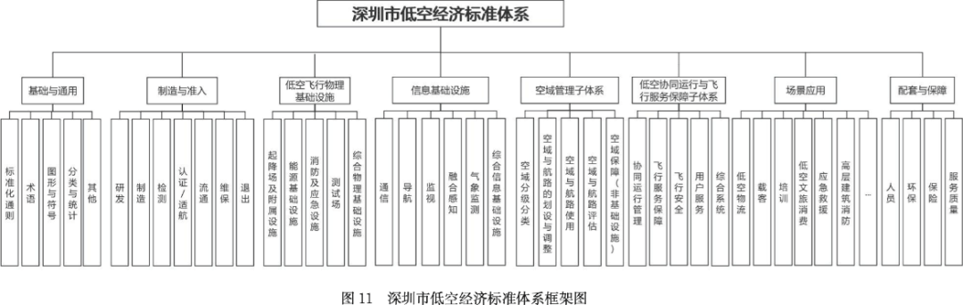 其中,“低空飞行物理基础设施”子体系对应深圳市低空经济“四张网”中的设施网,主要包括低空物理基础设施的场地技术要求、规划建设及运营管理指南等相关文件,为低空物理基础设施规范化建设及运营提供指引,包括起降场及附属设施、能源基础设施、消防及应急设施、测试场、综合物理基础设施5个二级子体系。