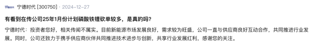 12月27日,宁德时代在互动平台表示,“公司2025年1月计划减少磷酸铁锂生产”的相关传闻不属实。
