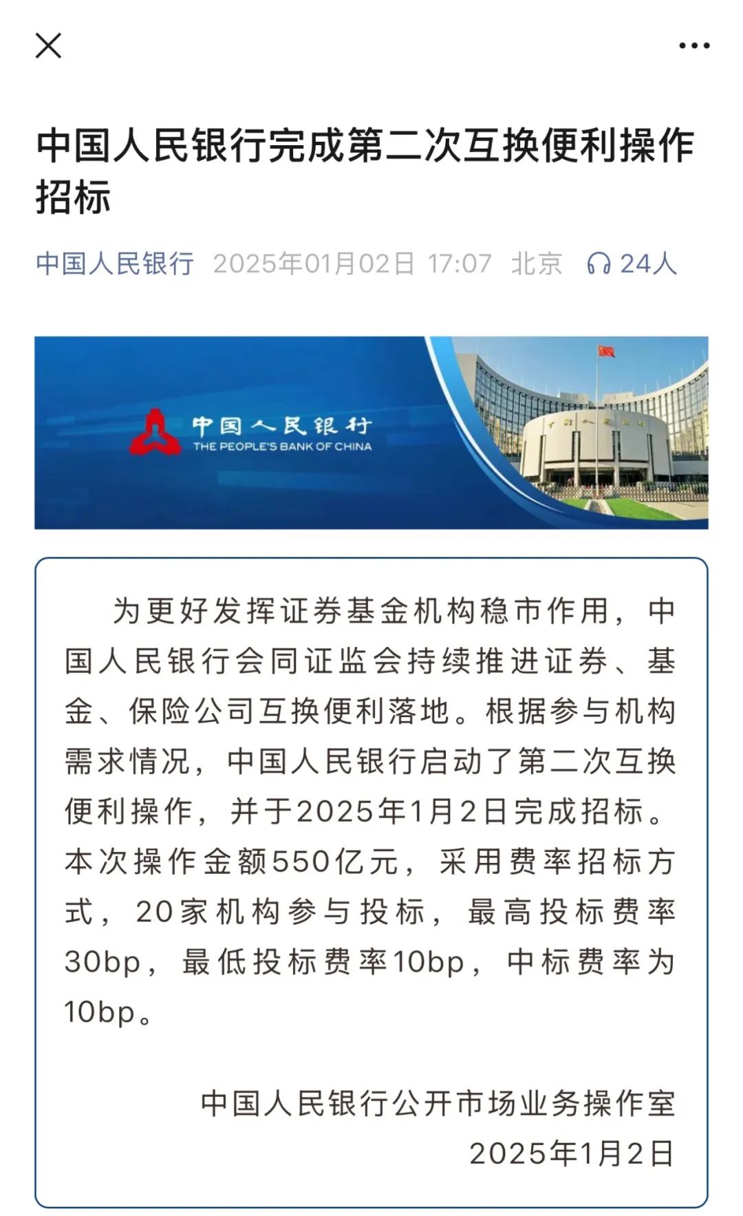 根据参与机构需求情况,中国人民银行启动了第二次互换便利操作,并于2025年1月2日完成招标。本次操作金额550亿元,采用费率招标方式,20家机构参与投标,最高投标费率30bp,最低投标费率10bp,中标费率为10bp。
