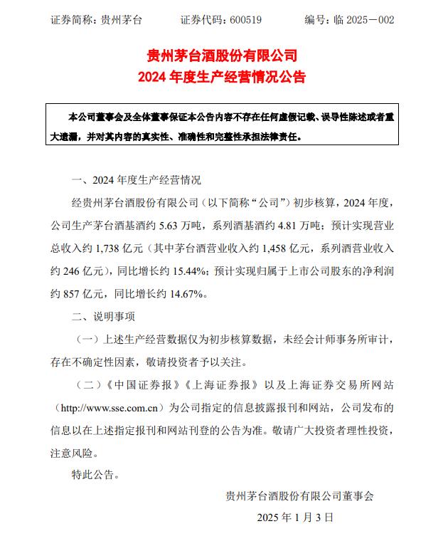 贵州茅台(600519)1月2日晚间公告,经公司初步核算,2024年度,公司生产茅台酒基酒约5.63万吨,系列酒基酒约4.81万吨;预计实现营业总收入约1738亿元(其中茅台酒营业收入约1458亿元,系列酒营业收入约246亿元),同比增长约15.44%;预计实现归属于上市公司股东的净利润约857亿元,同比增长约14.67%。