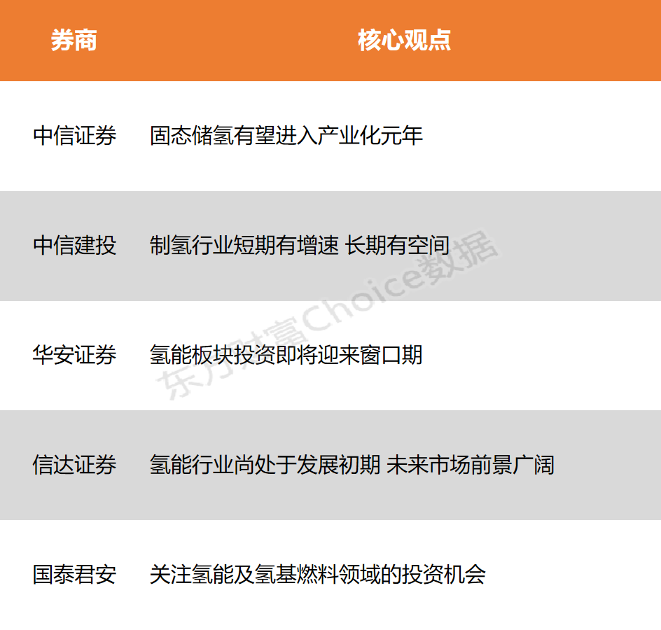 工信部等三部门近日印发《加快工业领域清洁低碳氢应用实施方案》,其中提到,高质量推进燃料电池汽车示范城市群建设,加快车辆推广和氢能供给体系建设,推动氢燃料电池汽车产业链技术、产品迭代开发应用。中信证券表示,固态储氢材料市场空间或将充分打开,产业化进程有望迎来加速;中信建投指出,制氢行业短期有增速,长期有空间;华安证券认为,氢能产业在政策扶持和市场需求双重驱动下,呈现快速发展态势,氢能板块投资即将迎来窗口期。