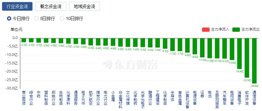 净流出方面,通信设备、软件开发、消费电子等净流出排名靠前,其中通信设备净流出26.95亿元。