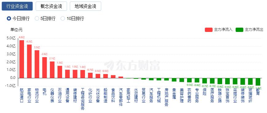 行业资金方面,截至收盘,航运港口、家电行业、物流行业等净流入排名靠前,其中航运港口净流入4.77亿。