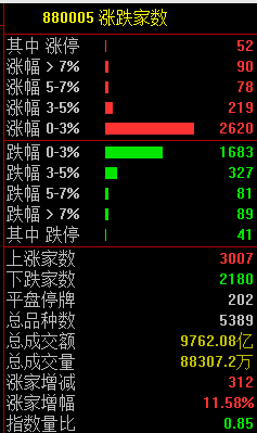 市场共3007只个股上涨,52只个股涨停,2180只个股下跌。