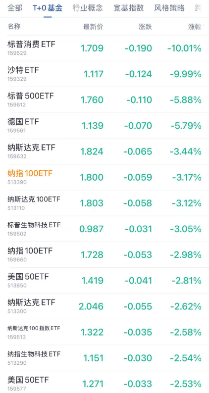 多只跨境ETF尾盘再度跳水,南方沙特ETF、景顺长城标普消费ETF跌停,嘉实德国ETF、国泰标普500ETF跌超5%。
