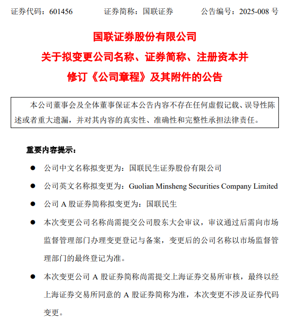 国联证券1月13日晚间公告,公司拟将中文名称变更为国联民生证券股份有限公司,英文名称变更为Guolian Minsheng Securities Company Limited,A股证券简称变更为国联民生。变更理由是公司发行A股股份购买民生证券股份有限公司99.26%股份并募集配套资金等事项已获中国证监会核准通过,基于公司战略发展需要,使公司名称更为全面、准确地反映公司基本情况及未来发展规划。本次变更尚需提交股东大会审议,并经上海证券交易所审核。